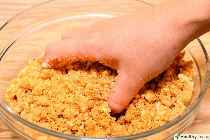 Висипте крихти крекерів у велику миску.використовуйте лопатку, щоб вмішати сіль і цукор. Переконайтеся, що всі інгредієнти ретельно перемішалися. Розтопіть масло в мікрохвильовій печі або на плиті, потім додайте його в суміш. Помийте руки і з їх допомогою змішайте інгредієнти згортаючими рухами, поки вони не перемішаються.- Якщо вирішили використовувати Солоне вершкове масло, не додавайте щіпку солі, передбачену в цьому кроці.