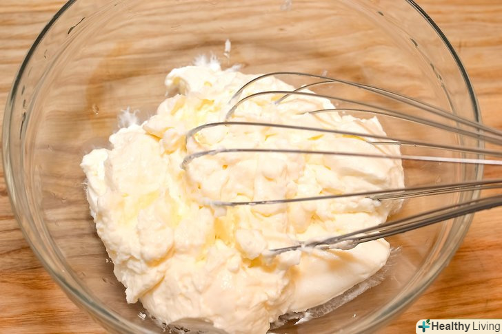 Розділіть вершковий сир на великі шматки.поріжте вершковий сир на шматки і помістіть їх в миску для змішування. Використовуйте тістоміс з лопатою, щоб отримати кремоподібну текстуру. Змішуйте вершковий сир на середній швидкості протягом 4 хвилин-в результаті вийде однорідна текстура.- Якщо немає тістоміса, покладіть вершковий сир у велику миску і використовуйте електричний міксер.