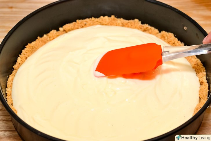 Вилийте начинку на корж.переконайтеся, що вилили всю начинку, а також, що вона не переливається через краї форми. Після цього, використовуйте лопатку, щоб зробити поверхню гладкою.