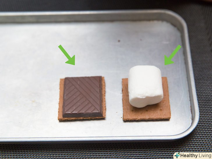 Покладіть зефір і шоколад на крекери.покладіть зефір на одну половинку крекеру, шоколад-на іншу. Шматочок шоколаду повинен бути трохи менше за розміром, ніж крекер. Якщо ви взяли занадто великий шматок шоколаду, поламайте його на більш дрібні шматочки.