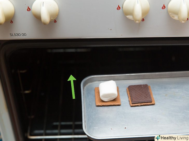 Розігрійте смор.не з'єднуйте крекери на даному етапі, ви зробите це, коли інгредієнти розігріються. Замість цього поставте деко в духовку. Шоколад злегка розтане, а зефір трохи зарум'яниться.