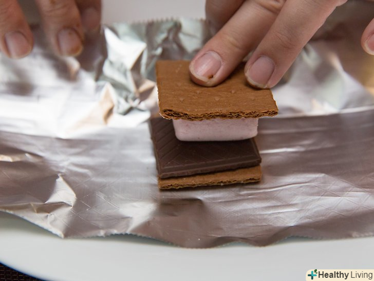 Спробуйте обсмажити смор цілком.спочатку зберіть весь смор, потім загорніть його в харчову фольгу, злегка змащену рослинним маслом. Запечатайте краю імпровізованого конверта. Нагрівайте конверт на вугіллі багаття протягом 2-3 хвилин.[6] не забувайте частіше перевертати конверт, потім дістаньте з вогню за допомогою щипців.- Ви можете розігріти конвертик зі смором на грилі. Температура гриля повинна бути 177°C.[7]