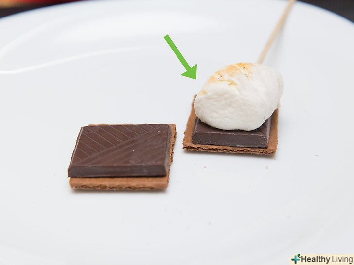 Покладіть на зефір шматочок шоколаду.коли зефір стане в'язким і м'яким, дістаньте тарілку з мікрохвильової печі. Якщо необхідно, скористайтеся прихваткою. Покладіть шматочок шоколаду на зефір. Шматочок шоколаду повинен за розміром приблизно збігатися з крекером.