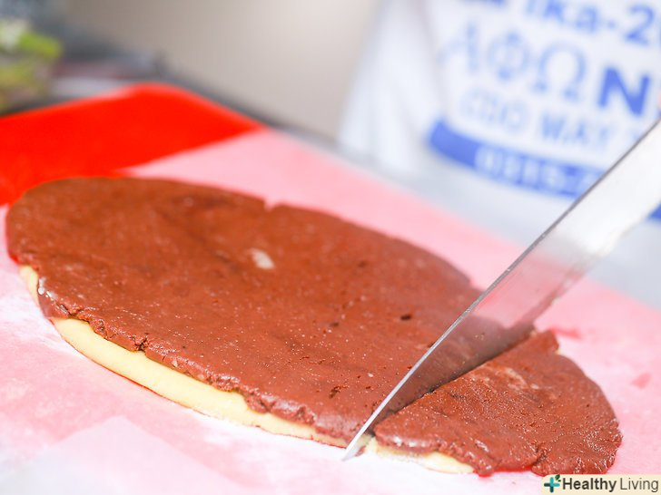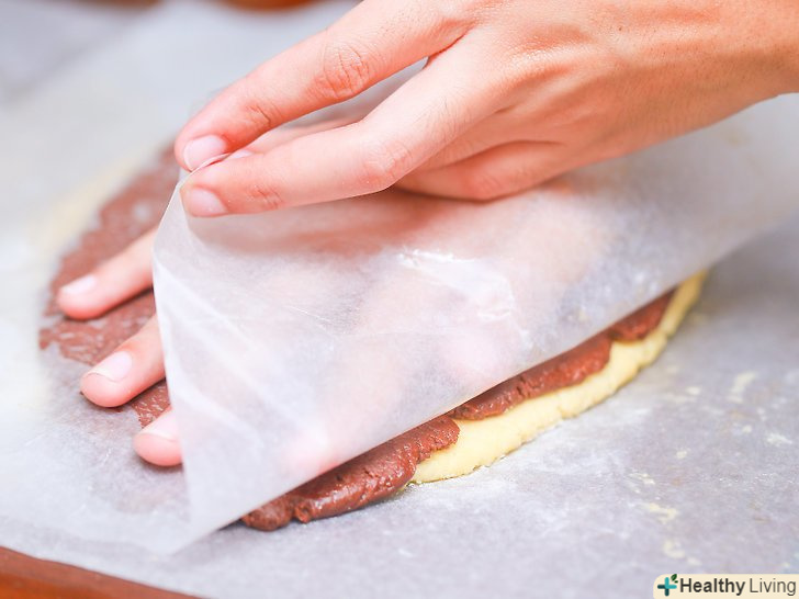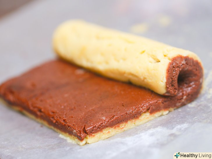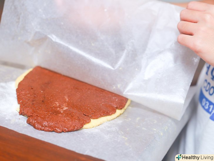 Розкачайте другу половину тіста (коричневе тісто) на другому шматку пергаментного паперу в прямокутник аналогічного розміру.використовуючи пергаментний папір, ви зможете легко підняти тісто з робочої поверхні, коли це необхідно буде зробити.