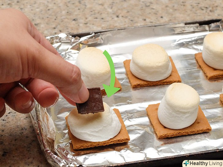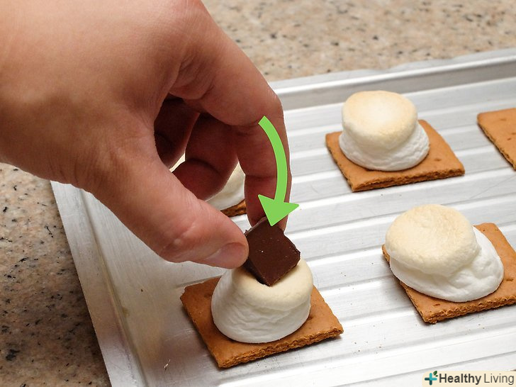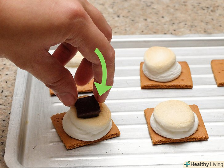 Помістіть шматочок гіркого шоколаду на вершину кожного смора.для приготування смора краще використовувати шоколад, який можна розбити на окремі часточки. На кожному сморі має поміститися від 2 до 4 часточок.