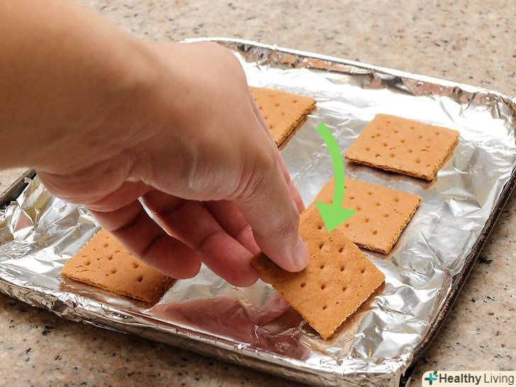 Розламайте навпіл кілька крекерів Грема.покладіть одну половинку крекерів на деко, залишаючи між ними трохи вільного простору. Решта поки відкладіть в сторону. Розламайте стільки крекерів Грема, скільки хочете приготувати сморов. Для приготування одного смора вам знадобиться один крекер Грема.
