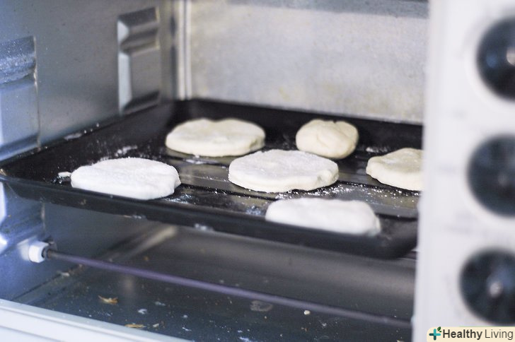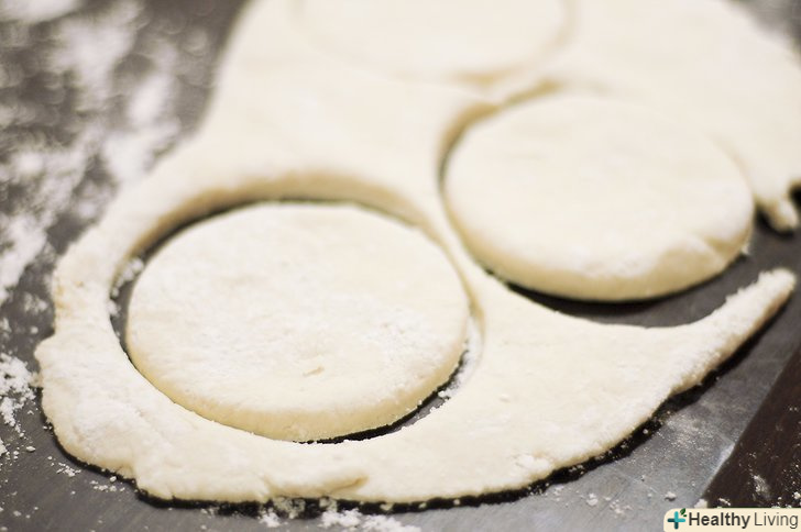 Наріжте тісто на шматочки розміром в 7,5 см.- Якщо у вас немає формочок для печива, або використовуйте ніж, щоб вирізати квадратики або кружечки за допомогою перевернутого склянки. Трохи борошна або Bisquick на ножі або склянці запобіжить прилипання.