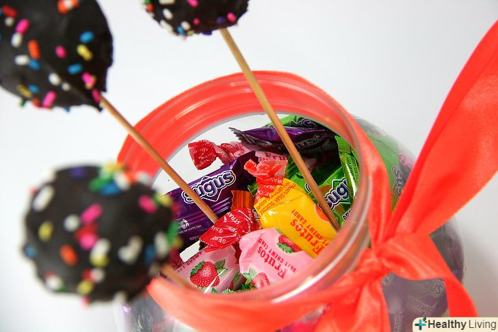 Заповніть красиву банку з широкою шийкою цікавими сушеними бобами або цукерками.переконайтеся, що вони упаковані щільно, а потім вставте тістечка – льодяники наверх. Пов'яжіть стрічку навколо банки.