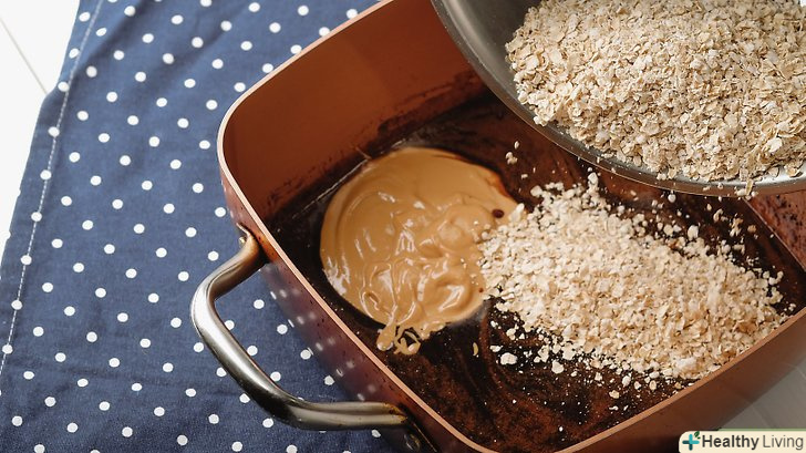 Коли суміш почне кипіти, зніміть миску з плити і додайте вівсянку. Обов'язково використовуйте вівсяні пластівці швидкого приготування. Ретельно перемішайте інгредієнти за допомогою ложки або лопатки. Продовжуйте заважати до тих пір, поки суміш не придбає однорідну консистенцію.