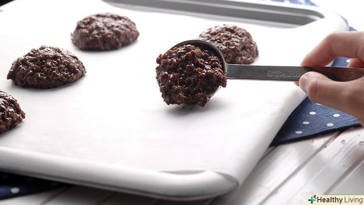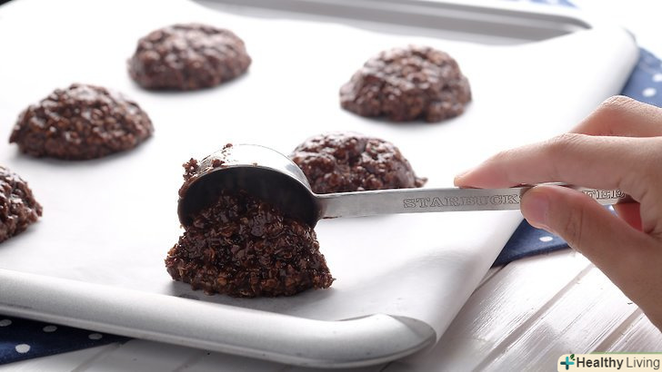 Використовуйте ложку, щоб викласти готове тісто на деко.Візьміть ложкою тісто і викладіть його на вощений папір. У вас повинно вийти печиво кулястої форми. Зворотною стороною ложки притисніть печиво, щоб воно набуло більш плоску форму.- В якості альтернативи сформуйте кілька кульок з тіста. Сформуйте з тіста печиво кулястої форми, потім умочіть готове печиво в мисці, наповненій кокосовою стружкою, подрібненим горіхом або какао-порошком.[7]