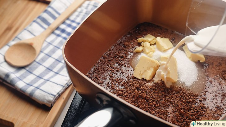 Змішайте цукор, молоко, масло, какао-порошок і сіль в мисці.перемішайте всі інгредієнти за допомогою ложки або лопатки. Поріжте масло на маленькі кубики. Завдяки цьому воно швидше розплавиться.- Якщо у вас алергія на молоко, використовуйте мигдальне, кокосове, соєве молоко або інше молоко, що не містить лактози.