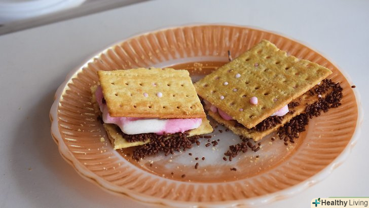 - Можна подати зефір у складіСмора.Візьміть крекер, розламайте його навпіл і помістіть на одну половину невеликий шматочок шоколаду. Поверх шоколаду покладіть скибочку зефіру (не знімаючи його з шампура або гілки) і притисніть його другою половиною крекеру. Притримуючи цією половиною зефір, обережно витягніть з нього шампур або гілку. Перш ніж подавати готову страву, трохи почекайте, щоб зефір встиг розплавити шоколад і охолонути.[7]