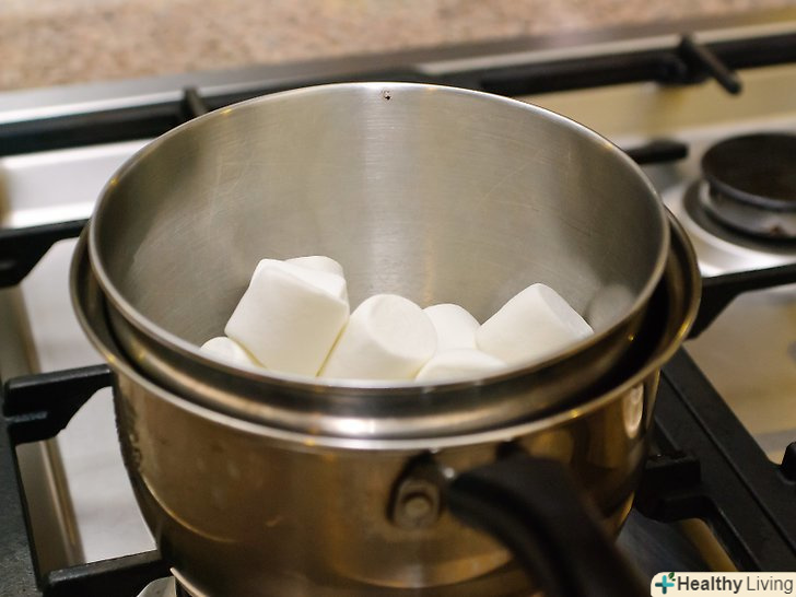 - Приготуйте посуд для розігрівання продуктів на пару.налийте на дно великої каструлі воду і помістіть зверху каструлю поменше. Замість другої каструлі можна використовувати також металеву жаростійку миску. При цьому дно верхньої каструлі або миски не повинно стосуватися води. За допомогою цього пристосування ви зможете повільно розігріти зефір і використовувати його в якості крему або помадки.