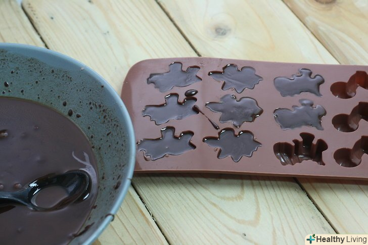 Розлийте Гарячий розтоплений шоколад у формочки.формочки можуть бути різноманітної форми і розміру, їх можна знайти в посудних магазинах. Наповніть формочки шоколадом до країв. При необхідності використовуйте тильну сторону ложки, щоб розрівняти поверхню шоколаду і рівномірно заповнити кути формочок.- Якщо у вас немає спеціальних формочок, використовуйте свою фантазію і пристосуйте під формочки підручні засоби. Вам допоможуть форми для міні кексів, паперові одноразові чашечки, стопки, будь-які інші маленькі контейнери.