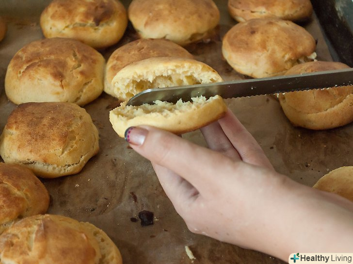 Розріжте профітролі на дві половинки.розріжте уздовж кожен профітроль навпіл, використовуючи ніж для хліба. Їх слід надрізати, як булочку для гамбургера. Усередині кожного профітроля повинна бути велика дірка.