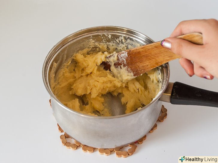 Додайте борошно.додайте борошно до суміші і збивайте дерев'яною ложкою або віночком, поки все не перемішається. Поставте каструлю назад на вогонь і сильно збивайте, поки суміш не буде з боків каструлі. Тісто буде змішуватися і на дні каструлі вийде тонкий шар.