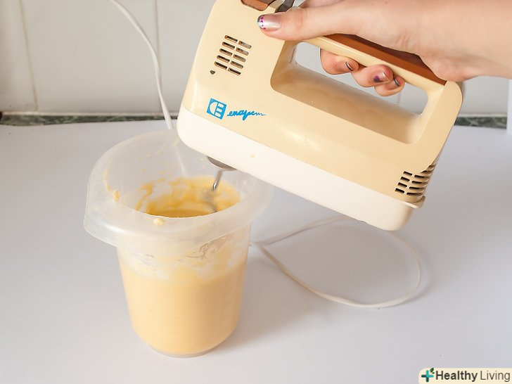 Додайте яйця.висипте суміш у велику миску або чашу міксера. Додайте по одному яйцю, збиваючи після кожного разу дерев'яною ложкою або міксером.- Може здатися, що суміш не перемішується, але не хвилюйтеся - вона перемішається-просто продовжуйте збивати.
