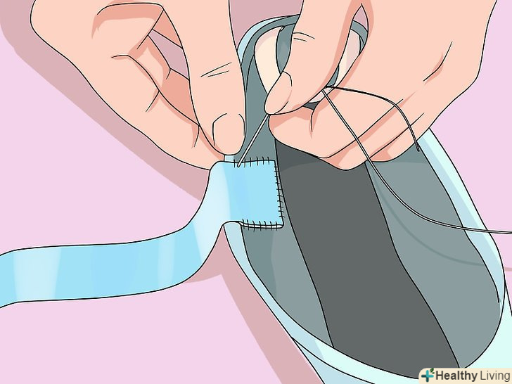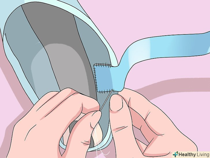 Пришийте стрічки до пуантів.пришийте кінці стрічок міцною або зубною ниткою точно так же, як гумку. Почніть пришивати з верхньої частини, біля внутрішньої гумки. Прошийте всі сторони стрічки зсередини, щоб вийшов квадрат.[11]- Пам'ятайте, що важливо не захоплювати зовнішню частину пуантів і внутрішню гумку.