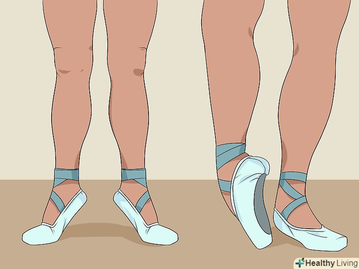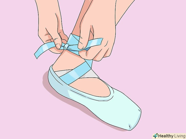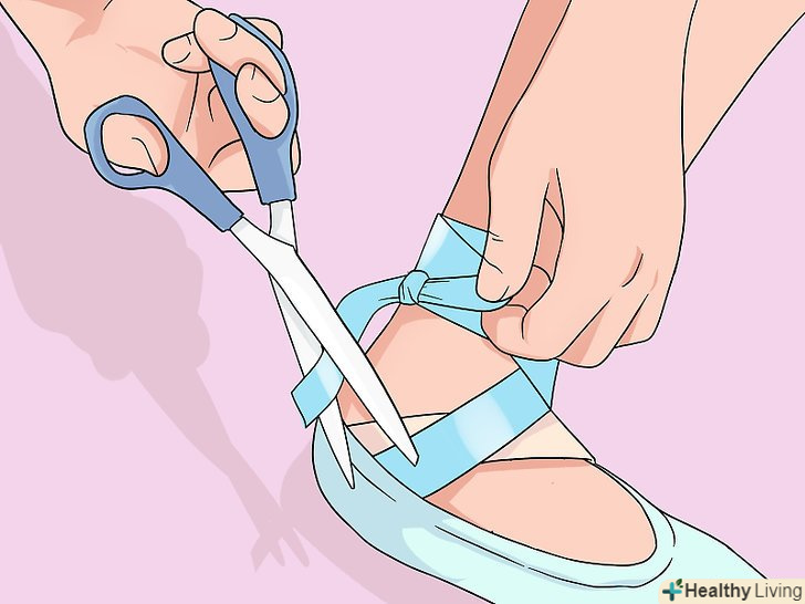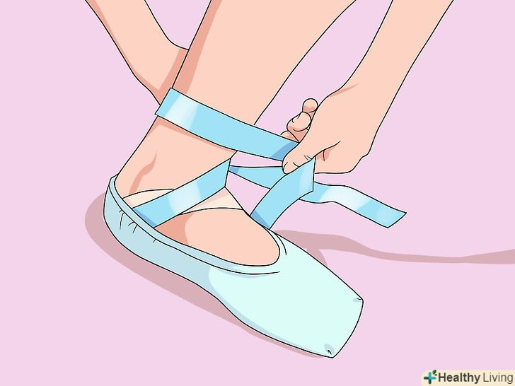 Оберніть щиколотку стрічками.одягніть пуант на ногу і поставте ступню на землю. Оберніть стрічкою ногу, починаючи з внутрішньої частини. Виконайте те ж саме в зворотному напрямку з іншого боку.[12]- Стрічки повинні закінчуватися трохи вище кісточки щиколотки.