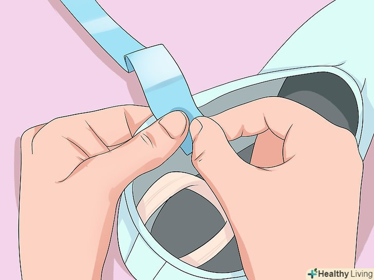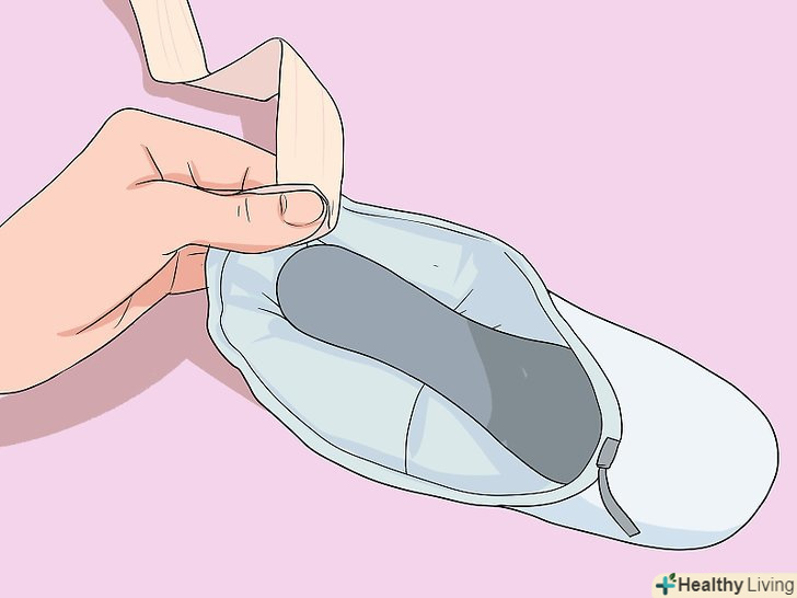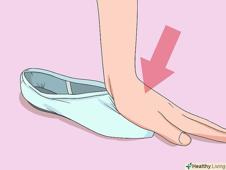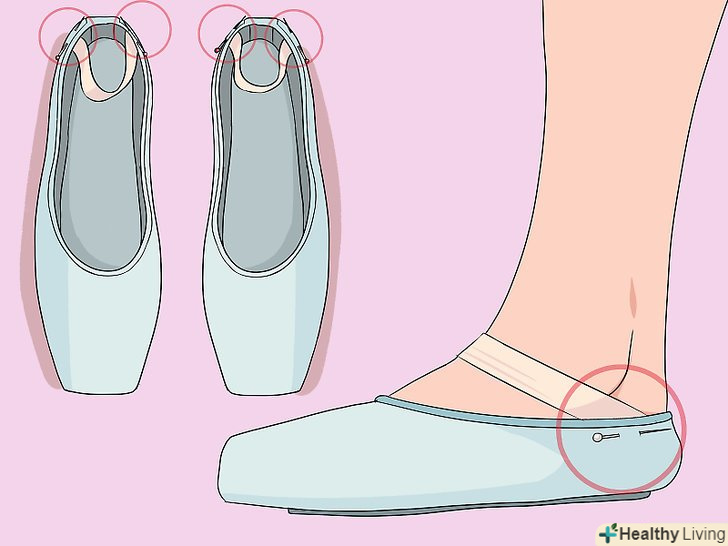 Закріпіть гумку шпилькою і перевірте, чи зручно вам.намітивши місця для кріплення гумки, закріпіть кінці шпилькою і надіньте пуанти. Слідкуйте за тим, щоб шпилька не проколола шкіру![3]- Гумка повинна сидіти щільно, але не дуже туго, інакше гумка буде передавлювати ступню.