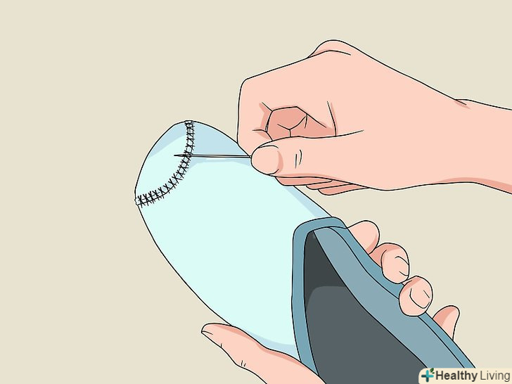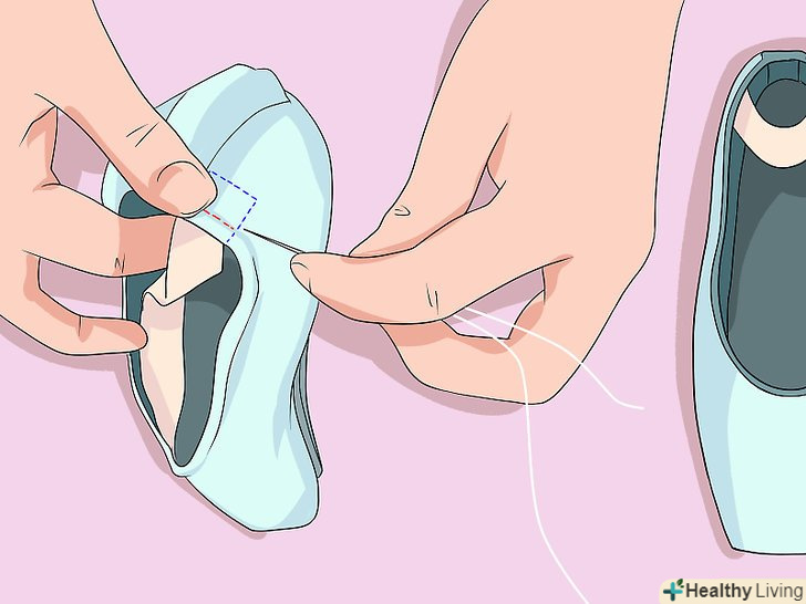 Видаліть тканину з носка пуантів для кращого зчеплення з підлогою.пуанти можуть ковзати по підлозі, тому для кращого зчеплення деякі танцюристи зрізають атлас з носка або пришивають до носка накладку.[23]- Прошийте опорну ділянку пуантів нитками. Опорна ділянка - це та частина пуантів, яка стоїть на підлозі, коли балерина стає на пуанти. Якщо ви не можете зробити це самі, зверніться за допомогою до дорослих.[24]