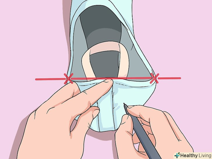 Намітьте місця кріплення стрічок. Складіть п'яту пуантів всередину. Відзначте олівцем місця, де п'ята стикається з внутрішньою гумкою з обох сторін. У цих місцях потрібно буде пришити стрічку.[7]- Можна також надіти пуанти на ноги і відзначити найвищу точку підйому з обох сторін. Відзначайте місця всередині пуантів, а не зовні.[8]