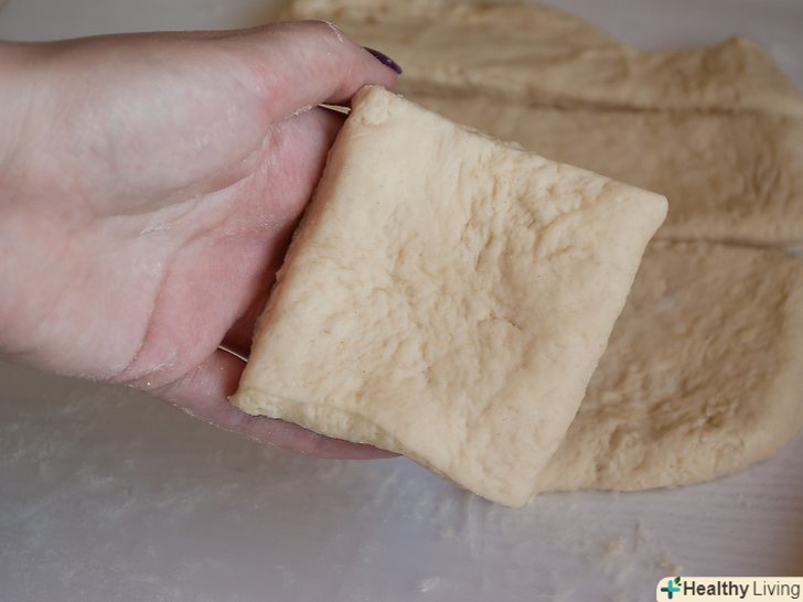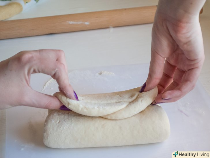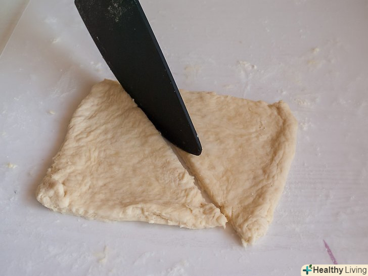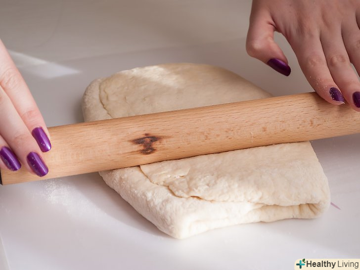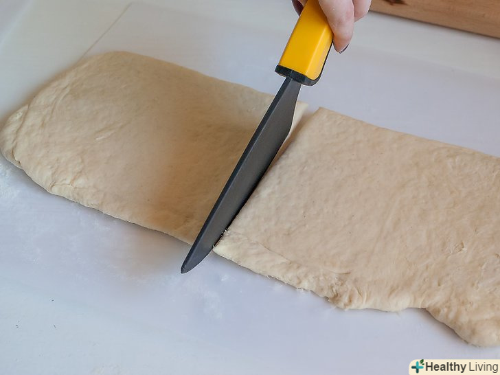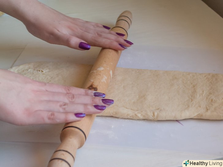 Розкачайте тісто.як тільки тісто збільшило свій обсяг в два рази, акуратно дістаньте його з миски і перекладіть на робочу поверхню, присипану борошном. Розкачайте тісто в прямокутник розміром 20 х 30 см.постарайтеся розкачати тісто так, щоб краї вийшли максимально рівними. Розкачайте тісто руками або скористайтеся качалкою, але не тисніть занадто сильно.