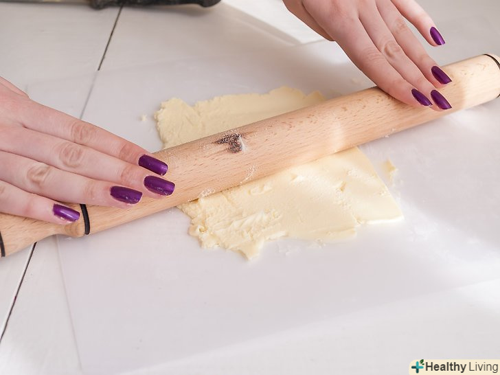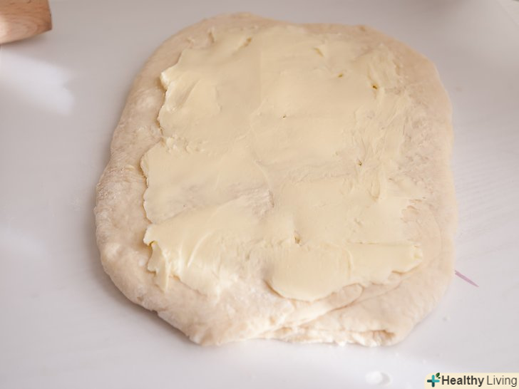 Розкачайте масло.застеліть стільницю вощеним папером. Викладіть охолоджене масло на папір і загніть кінець паперу так, щоб він закривав масло. За допомогою качалки розкачайте масло між шарами вощеного паперу в прямокутник розміром 30 х 15 см. Спочатку постукайте качалкою по шматку масла, щоб розім'яти його трохи, а потім розкачайте в прямокутник. Постарайтеся зробити це швидко, щоб масло не стало занадто теплим.- Важливо пам'ятати, що масло не повинно розтанути до моменту випічки! Намагайтеся, щоб масло не розм'якло і не стало кімнатної температури. Якщо необхідно, ставте його періодично в холодильник.