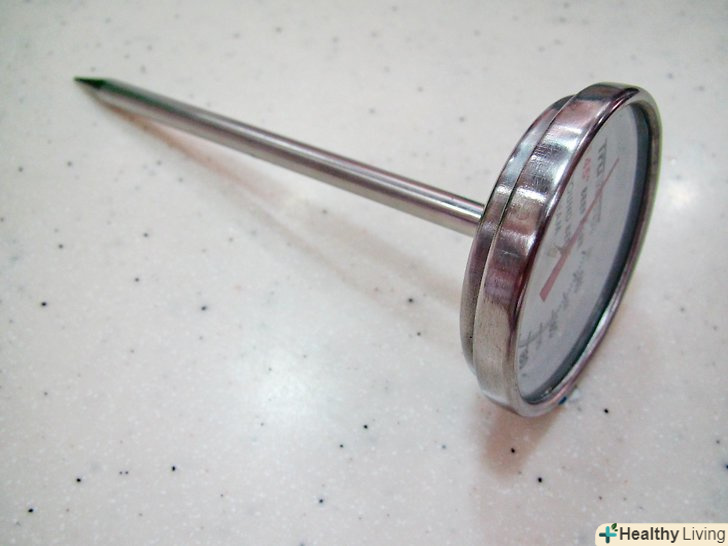 Вставте термометр.ви повинні довести шоколад приблизно до 38 °C, але не вище. Після того, як він досягне цієї позначки, зніміть миску з вогню і додайте до решти шоколаду, загальна температура якого повинна становити 32 °C. продовжуйте розмішувати. Коли все розтане, можна буде почати розливати шоколад!- Якщо у вас немає термометра для шоколаду, не варто впадати у відчай. Просто зніміть шоколад з вогню, коли він гарненько розтопиться і буде ретельно перемішаний. Дайте йому для охолодження пару секунд, перш ніж поміщати його в форми.