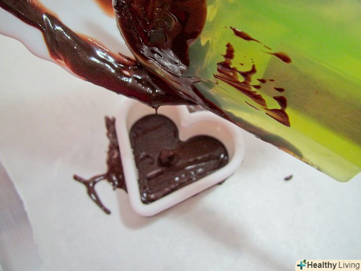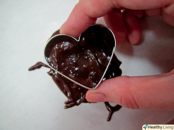 Розлийте у форми.коли шоколад буде розтоплений і досягне потрібної температури, починайте лити його в форми. Силіконові або металеві підійдуть добре, але будьте обережні з пластиком — гарячий шоколад може привести до його деформації. Обов'язково постукайте дном форми об плоску тверду поверхню, щоб позбутися від бульбашок.- Крім того, ви можете вилити шоколад на деко для випічки, вистелений вощеним папером. Струсіть його трохи і натисніть на нього, щоб видалити бульбашки, і дайте йому постояти в холодильнику або на столі. Тоді ви зможете просто розігріти металеві формочки над газовою плитою і вирізати фігури так, як вам подобається.