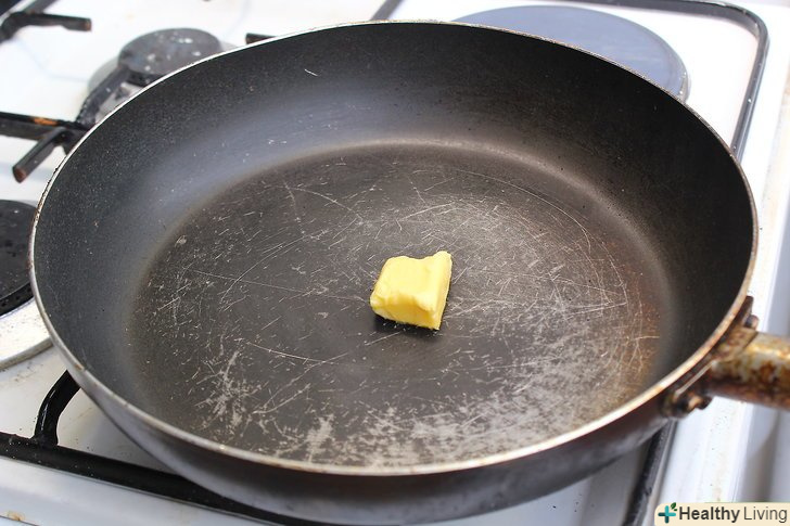Розтопіть на сковороді з товстим дном на середньому вогні 2 столові ложки (28 г) вершкового масла.поставте сковороду на середній вогонь. Додайте вершкове масло і періодично помішуйте дерев'яною ложкою. Дочекайтеся, коли масло розтане.[2].- Для цього рецепта найкращим чином підійде сковорода діаметром близько 30 см.[3]