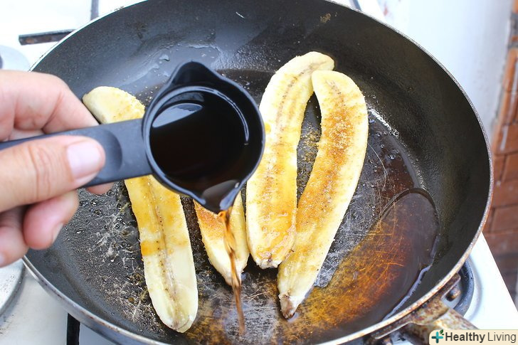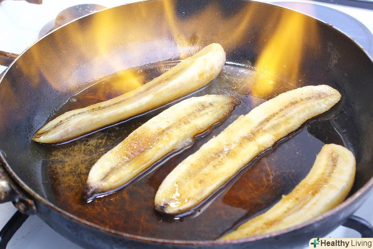 Обсмажте шматочки бананів в сковороді протягом 2 хвилин.покладіть шматочки бананів в сковороду в розтоплене масло. Акуратно помішуйте, поки вони готуються.[4]- В процесі обсмажування дуже важливо помішувати банани, але робити це потрібно дуже обережно, щоб вони не перетворилися в пюре.