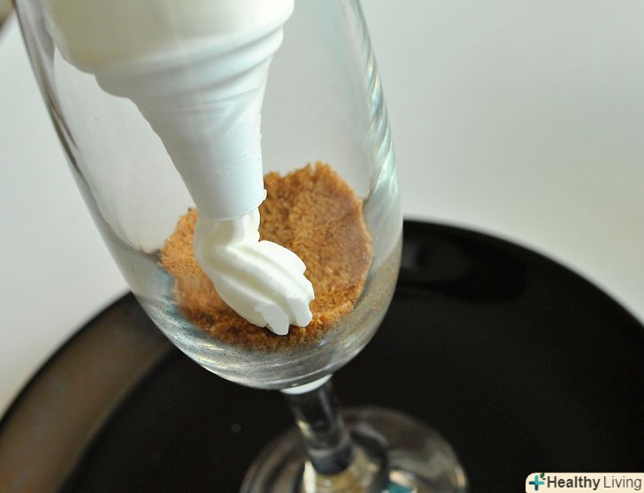 Насипте на дно кожного келиха подрібнене печиво (1 см).ложкою або невеликою склянкою добре утрамбуйте подрібнене печиво (баночка для спецій підійде ідеально для цієї мети). Цей рецепт розрахований на три келихи. Залиште подрібнене печиво для наступних шарів.