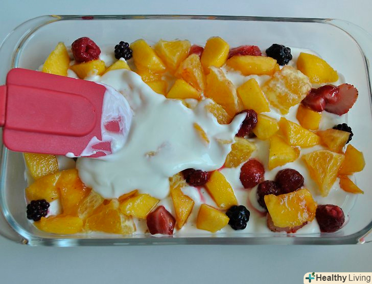 Додайте шар фруктів і наступний шар крему.помістіть шар фруктів в келих і зверху покрийте його шаром крему. Якщо у вас немає фруктового коктейлю, можна використовувати фрукти, які є у вас під рукою.