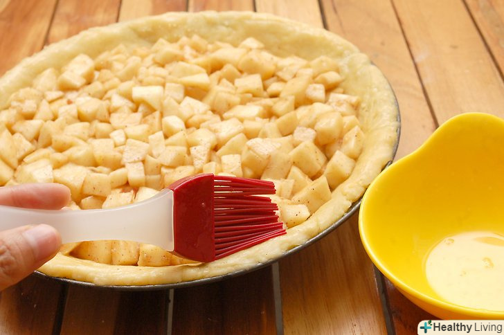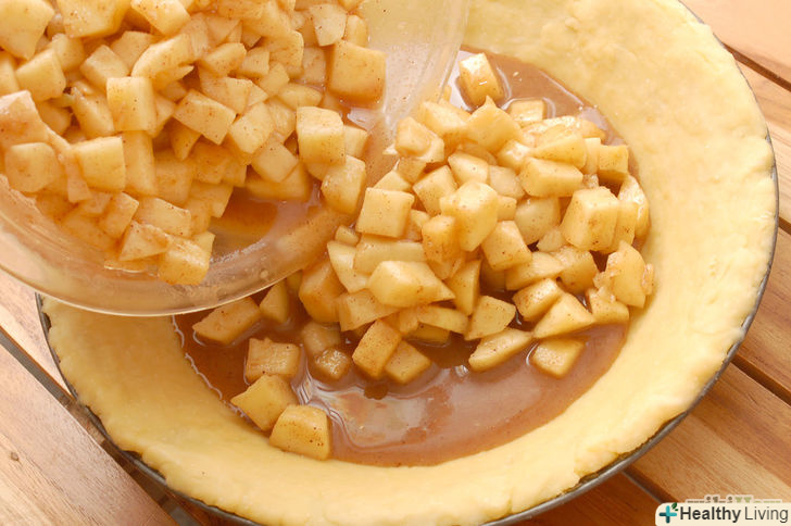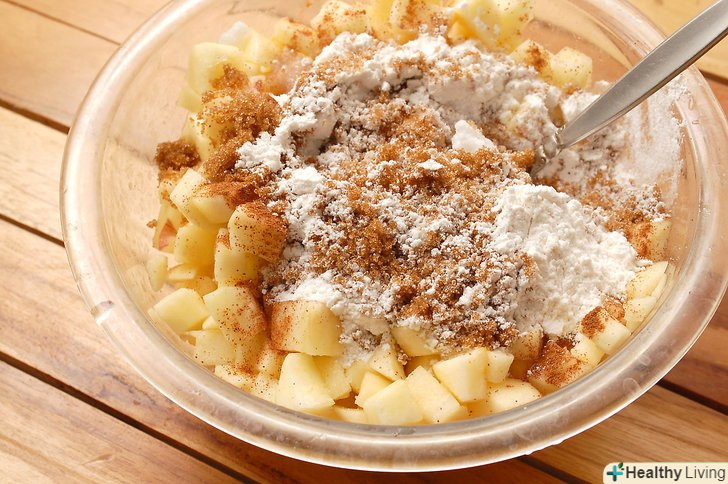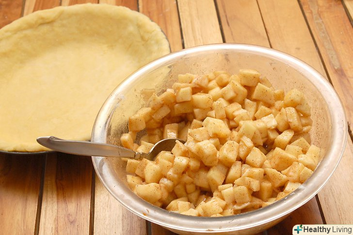 Приготуйте начинку.очистіть і наріжте яблука, а потім порубати на кубики розміром в сантиметр. Викладіть рубані яблука в миску і змішайте з цукром, сіллю, лимонним соком, борошном, мускатним горіхом і корицею. Поставте суміш в холодильник.