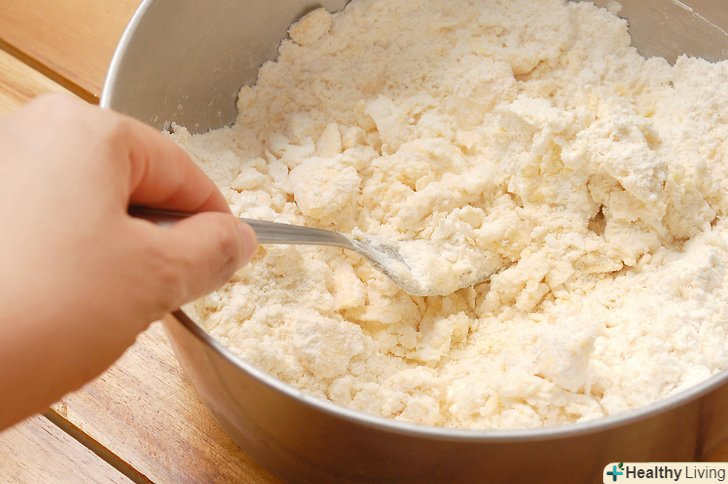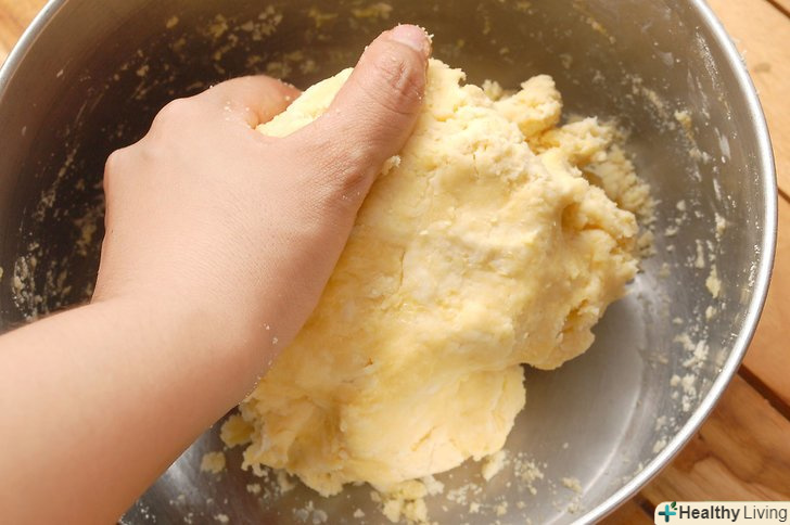 Посипте руки борошном і замісіть тісто.скачайте тісто у велику кулю, розділіть його на дві частини. Загорніть одну частину в харчову плівку і поставте в холодильник.- Або загорніть обидві частини і поставте їх в холодильник на 30 хвилин, перш ніж працювати з тестом далі.