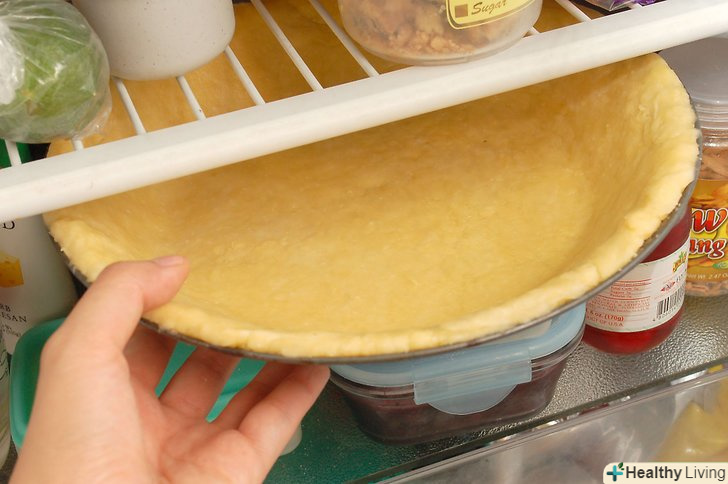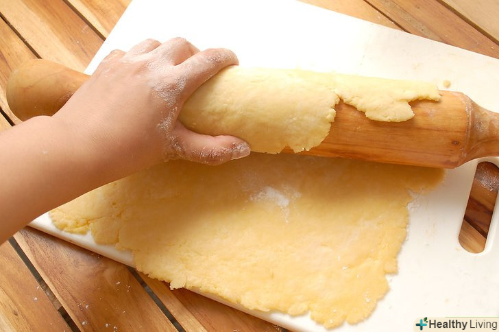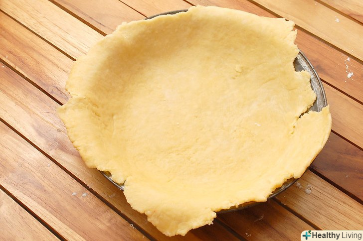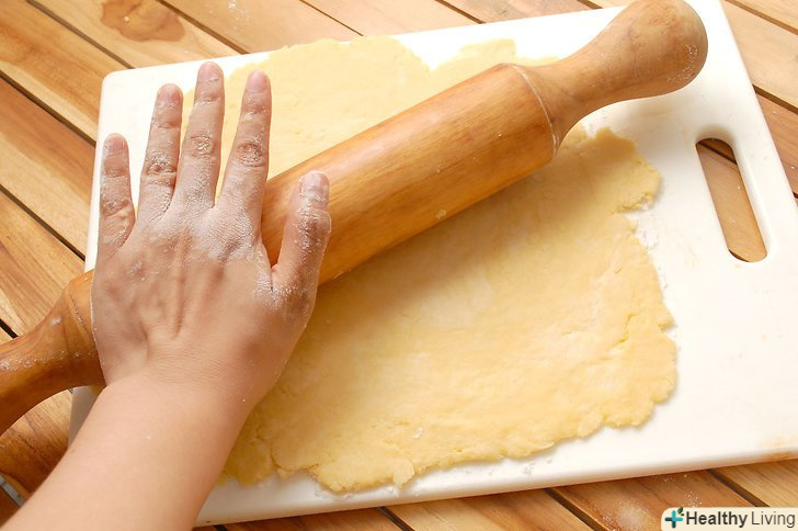Розкачайте тісто в коло на 5 сантиметрів більше, ніж діаметр форми для випікання.деякі кухарі вважають за краще класти харчову плівку між тестом і качалкою на початку розкочування, щоб тісто не прилипло до качалці.