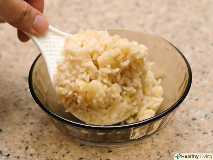 Перемішайте рис, перш ніж подавати до столу.робити це слід у напрямку від країв до центру страви за допомогою дерев'яної ложки або гумової лопатки. Розімніть всі великі грудки. Тепер у вас є ідеально приготований коричневий рис, який гармонійно поєднується з овочевим асорті, гострим тушкованим м'ясом або шматочком смаженої риби.[12]- Ніколи не використовуйте металеві кухонні прилади, щоб перемішувати або накладати рис, адже так можна подряпати внутрішню поверхню рисоварки.[13]
