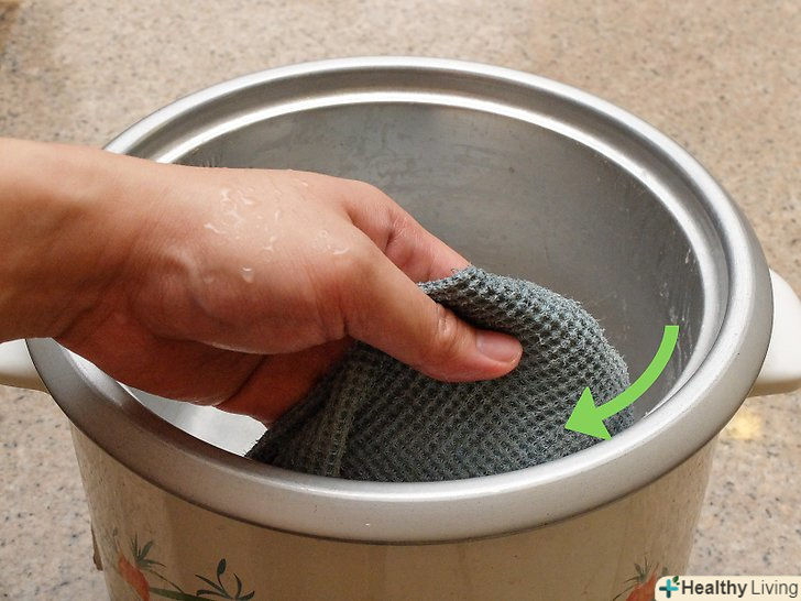 Протріть внутрішню поверхню рисоварки вологою тканиною.намочіть тканину в теплій воді, щоб розчинити крохмаль. Після цього частинки рису можна буде легко видалити. Сушіть прилад у відкритому вигляді, після чого закрийте кришку і поставте рисоварку на зберігання до наступного разу.[18]- Потріть чашу щіточкою для посуду з м'якими щетинками або грубою стороною кухонної губки, якщо для очищення необхідно щось більш ефективне, що дозволить відтерти залишки прилип рису.[19]