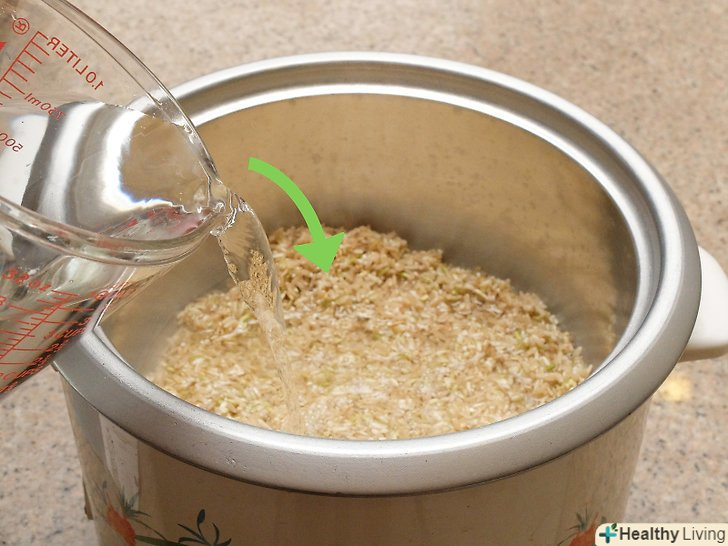 Додайте необхідну кількість води.рідини повинно бути на 50% більше, ніж використовується для приготування білого рису — це Головне правило при приготуванні коричневого рису. Тому, якщо зазвичай ви використовуєте один стакан води на кожну склянку рису, то в цей раз знадобиться півтори склянки води, враховуючи різницю в текстурі продукту. Часу на приготування коричневого рису піде більше, оскільки він твердіше білого.[4]- На відміну від білого рису, зерна коричневого містять волокнисті висівки. В результаті цього крупа гірше вбирає воду, і знадобиться більше часу, щоб довести його до ідеальної температури.[5]