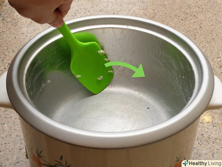 Зішкребіть залишки присохлого рису.пройдіться краєм лопатки (або просто пальцями) уздовж стінок і дна приладу і видаліть присохлі залишки. Викиньте їх у відро для сміття. Рукою зішкребіть якомога більше, і тоді вам залишиться тільки гарненько протерти рисоварку.[17]- Зсередини поверхня приладу зазвичай покрита гладким антипригарним шаром, тому його легко чистити.