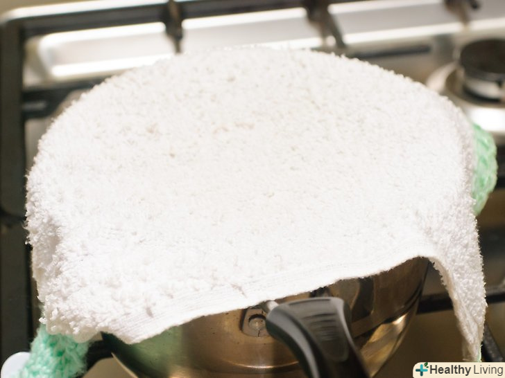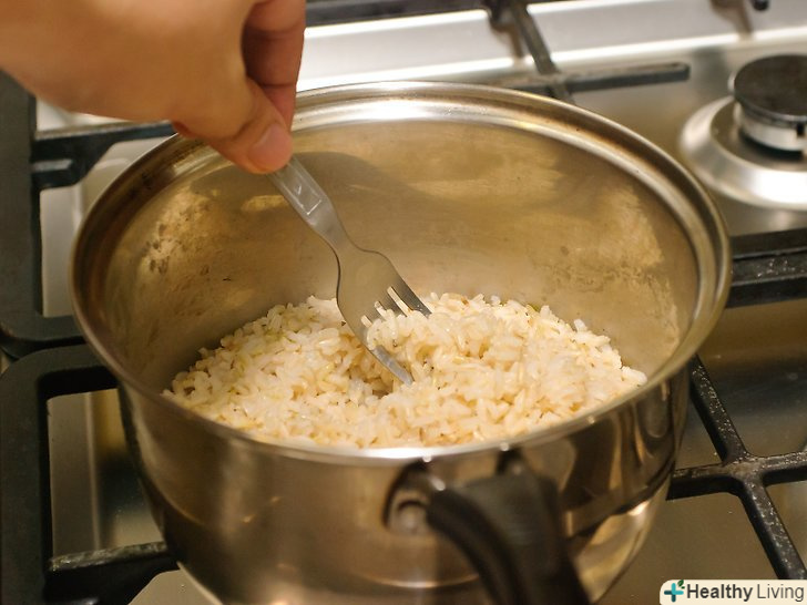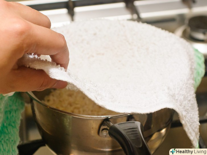 Зніміть каструлю з вогню і накрийте рушником.коли рис буде готовий, зніміть каструлю з плити і відкрийте кришку. Покладіть поверх каструлі складене кухонний рушник і швидко закрийте кришку.[17]- Рушник допоможе розпарити рис, щоб він став розсипчастим. Також воно поглине зайву вологу, яка в іншому випадку вбереться в продукт.[18]