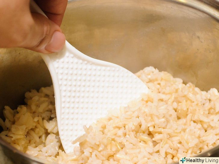 Відкрийте рисоварку і вспушіть рис.акуратно зніміть кришку рисоварки, намагаючись при цьому не отримати опіки від гарячої пари. Дерев'яною лопаткою або ложкою для рису акуратно його збийте.[26]