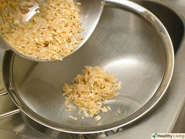 Злийте воду.за допомогою сітчастого фільтра злийте воду, яка не вбралася в рис.- Можна використовувати друшляк, але його отвори повинні бути дуже маленькими, інакше рис під час проціджування може в них провалитися.