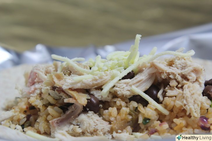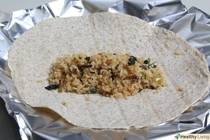 Помістіть коржик на великий лист алюмінієвої фольги і покладіть здорову порцію мексиканського рису в прямокутнику в середині коржі.форма не така вже й важлива, якщо ви залишите місце з усіх боків для загортання. Якщо ви не хочете готувати мексиканський рис, ви завжди можете використовувати білий рис або навіть коричневий рис для більш корисного варіанту.