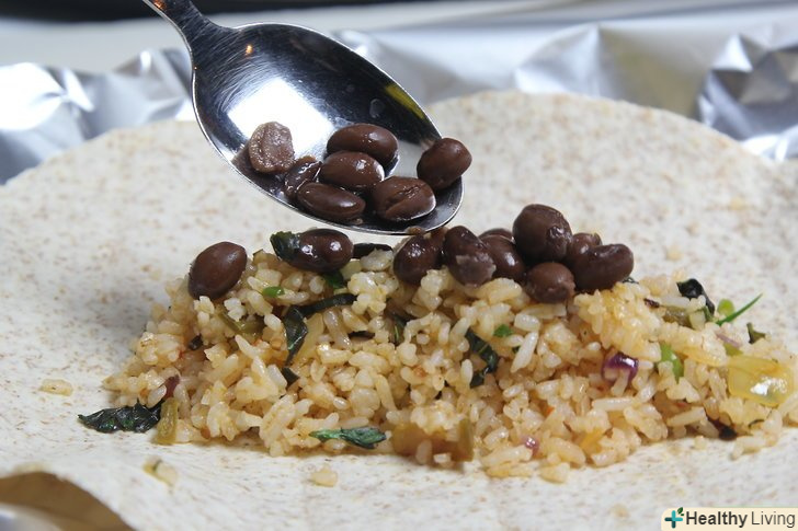 Покладіть поверх рису трохи бобів.якщо ви вибрали чорні боби для додавання в буріто, то злийте всю зайву рідину перед додаванням. Знову, порції не фіксовані. Багато людей додають зовсім небагато, але ви можете додати стільки, скільки хочете.