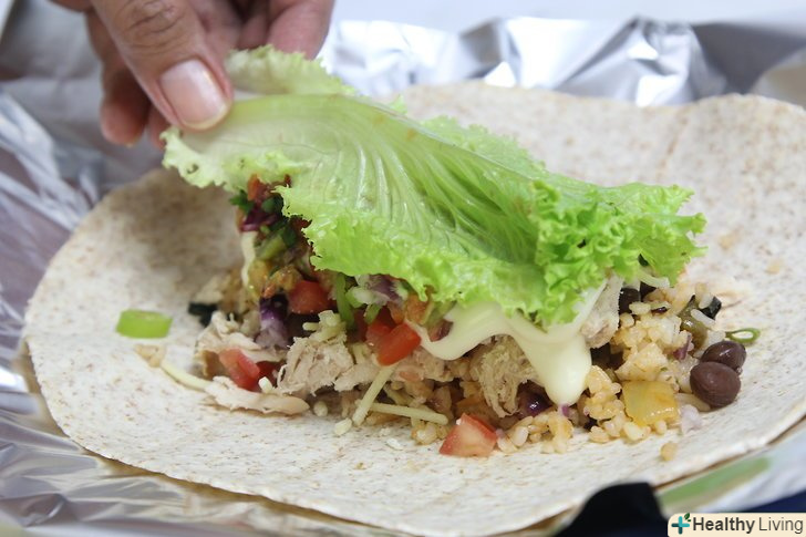 Покрийте салатним листям.хрусткі, соковиті салатні листя додають аромат. Особливо, якщо вміст буріто тепле, салатні листя можуть трохи зів'янути. Тому додайте трохи більше, ніж збираєтеся.