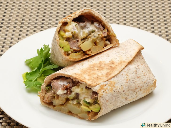 Заповніть буріто.покладіть корж на плоску поверхню. Викладіть начинки з одного кінця тортильї: деяка кількість теплого м'яса, сир, авокадо (або гуакамоле), картопля-фрі, сметану — при цьому вам необхідно залишити приблизно 2/3 коржі. Слідкуйте, щоб начинки не було занадто багато: не варто накладати начинки більше 2,5–5 см в ширину і 2,5 см у висоту. Якщо начинки буде занадто багато, вам буде складно загорнути буріто.
