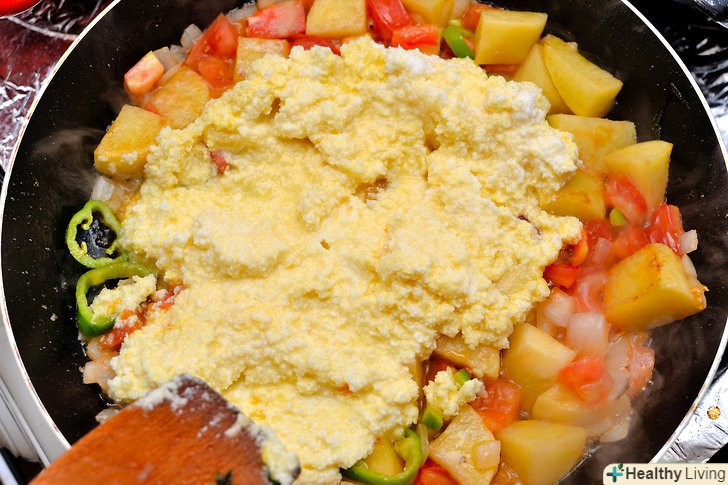 Після того, як цибуля підрум'яниться, додайте помідори, ретельно змішайте.
