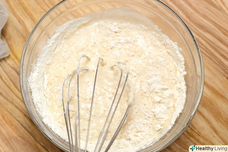 Почніть місити тісто, додавши борошно у велику миску з більшою частиною суміші з дріжджів.